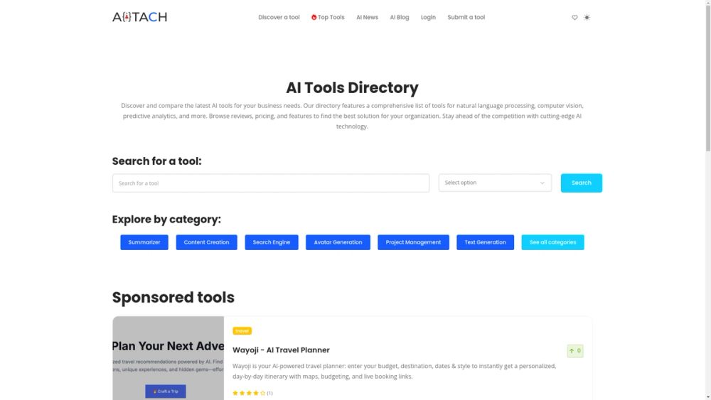 - Centralized discovery: searchable index of AI tools across many domains (NLP, computer vision, predictive analytics, content creation, marketing, video/image generation, education, fitness, and more).
