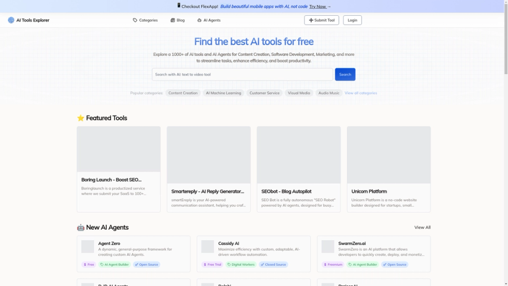 AI Tools Explorer is a comprehensive directory of 1000+ AI tools and AI agents, offering discovery, comparison, and curated lists across categories like content creation, development, marketing, and customer service.