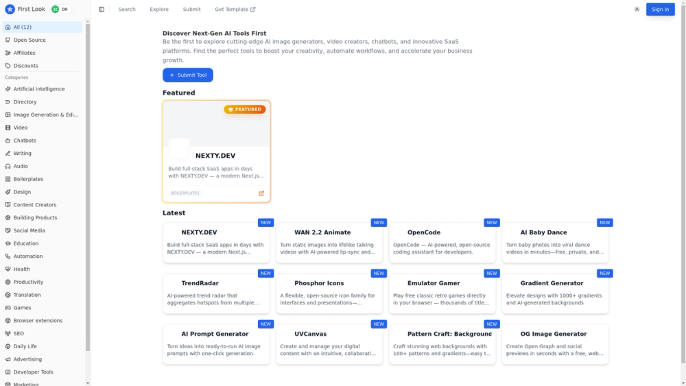 First Look is a curated directory that surfaces the latest AI tools, SaaS platforms, and developer-focused products. It provides searchable, categorized listings with screenshots, logos, and short descriptions to help creators, developers, and businesses find and evaluate new tools quickly.