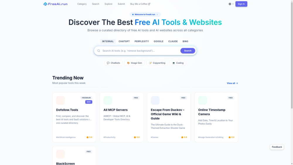 FreeAi.run is a curated directory of free and freemium AI tools and websites, focused on helping developers, creators, and businesses discover practical AI solutions. The site aggregates tools across categories — chatbots, image generation and editing, productivity, developer tools, and more — with concise listings that include logos, short descriptions, pricing tiers, and tags.