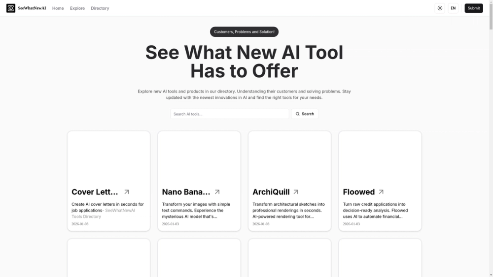 SeeWhatNewAI is a curated directory that catalogs new AI tools, products, and services with screenshots, descriptions, and metadata to help technical users discover and evaluate solutions quickly.